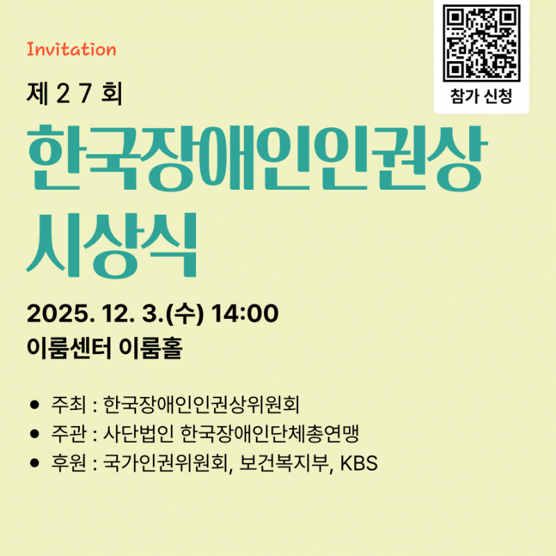 한국장총은 “매년 한국장애인인권상은 장애인 인권 향상에 기여한 공로를 널리 알리고 사회적 지지를 확산하는 계기”라며 “이번 수상자들의 활동이 우리 사회의 포용성을 높이는 밑거름이 되길 바란다”고 밝혔다. 시상식 참석 등록은 초청장 QR코드 또는 한국장총 홈페이지를 통해 신청할 수 있다.