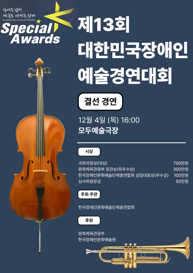 한국장애인문화예술단체총연합회(장예총)가 오는 12월 4일 오후 4시 서울 충정로에 위치한 모두예술극장에서 제13회 대한민국장애인예술경연대회 스페셜K의 결선 경연인 '스페셜K 어워즈'를 개최한다.