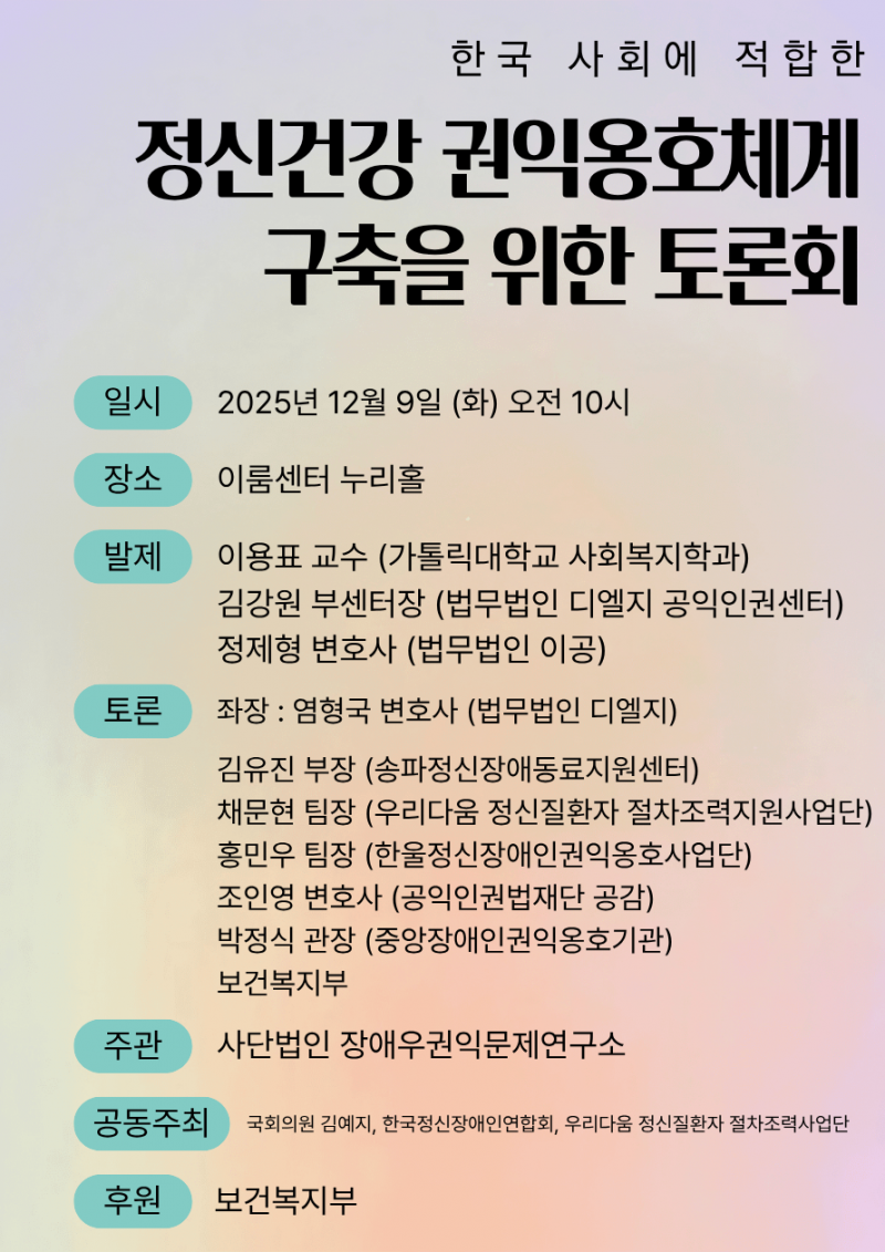 (사)장애우권익문제연구소는 오는 12월 9일 오전 10시 국회의원회관 누리홀에서 '한국 사회에 적합한 정신건강 권익옹호체계 구축을 위한 토론회'를 개최한다.
