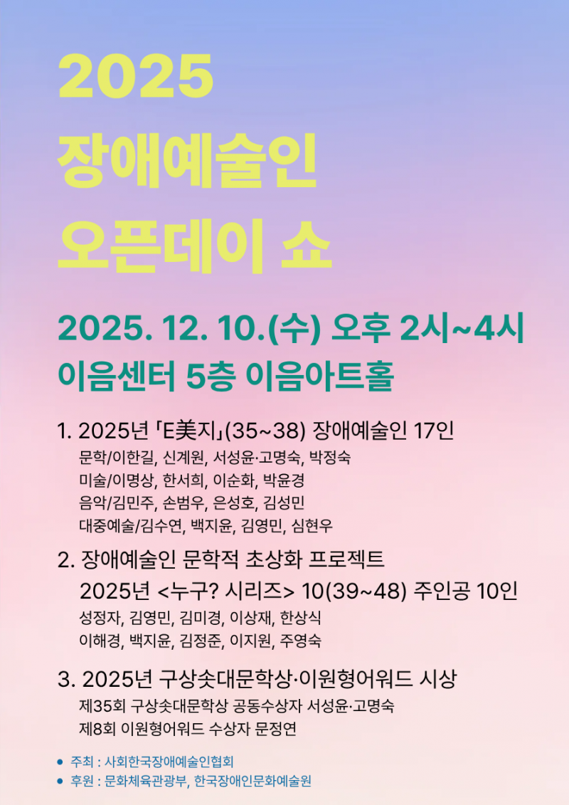 ‘2025년 장애예술인 오픈데이 쇼’에는 E美지(35~38호)에 소개되었던 장애예술인 17인(이한길, 신계원, 서성윤&고명숙, 박정숙, 이명상, 한서희, 이순화, 박윤경, 김민주, 손범우, 은성호, 김성민, 김수연, 백지윤, 김영민, 심현우), 장애예술인 문학적 초상화 프로젝트 <누구?!시리즈> 10종 발간(39~48호)에 참여한 중견장애예술인 10인(성정자, 김영민. 김미경, 이상재, 한상식, 이해경, 백지윤, 김정준, 이지원, 주영숙), 2025년 제35회 구상솟대문학상 공동수상자 서성윤, 고명숙 시인 그리고 제8회 이원형어워드 수상자 문정연 화가가 함께한다.