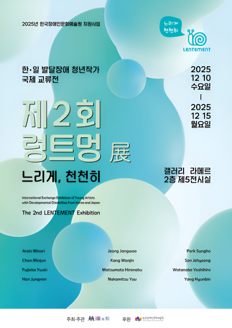 (사)도와지가 주최·주관하고 한국장애인문화예술원이 후원하는 ‘제2회 렁트멍(느리게, 천천히) 展 – 한·일 발달장애 청년작가 국제 교류전’이 12월 10일부터 15일까지 서울 인사동 갤러리 라메르 제5전시실에서 열린다.