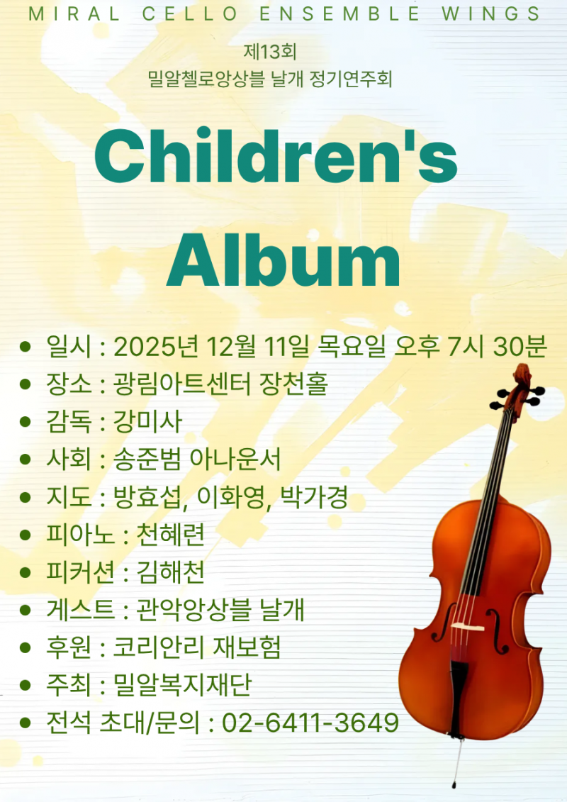 제13회 밀알첼로앙상블 날개 정기연주회는 전석 초대로 진행되며, 초대권 문의는 밀알문화예술센터(02-6411-3649)로 가능하다.