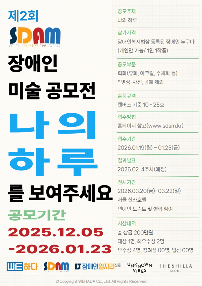 장애인 고용 플랫폼 기업 WE하다가 주최하고 장애 예술가 플랫폼 SDAM, 장애인일자리신문이 주관하는 이번 공모전은 ‘나의 하루’를 주제로 장애인 예술가들이 일상 속에서 경험하는 순간들을 자유롭게 표현한 작품들을 모집한다.