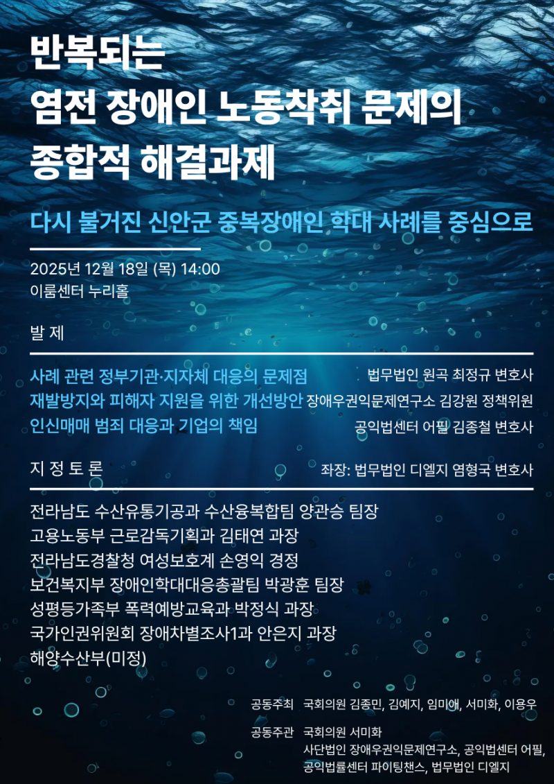토론회는 최근 드러난 중복장애인의 염전 노동착취 사례를 계기로 마련됐다. 피해자인 A씨는 2014년과 2023년 두 차례에 걸쳐 피해 사실이 민·관 합동조사에서 확인됐음에도, 적절한 보호 조치 없이 동일 염전에서 장기간 착취를 당한 것으로 드러났다. 이후 요양병원으로 보내진 뒤 성년후견 신청 과정에서 37년 만에 가족과 재회하게 됐다.