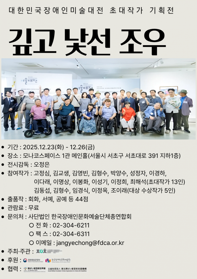 (사)한국장애인문화예술단체총연합회(이하 장예총)가 주최·주관하는 대한민국장애인미술대전 초대작가 기획전 《깊고 낯선 조우》가 오는 12월 23일(화)부터 26일(금)까지 서울 강남구 모나코스페이스 1관 메인홀에서 열린다. 본 전시는 문화체육관광부와 (재)한국장애인문화예술원의 후원으로 진행된다.