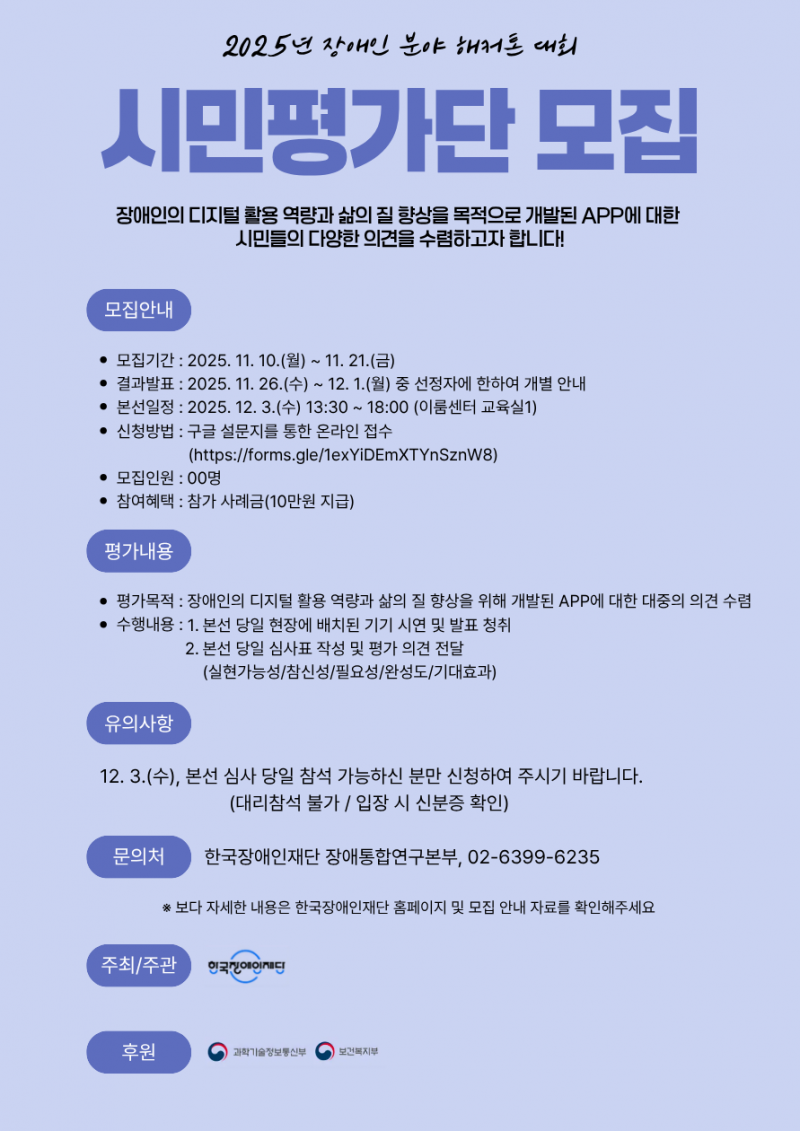 2025년도 장애인 분야 해커톤 대회 : 장애 플러스 기술, 장애인을 위한 APP 개발 공모전 시민평가단 모집