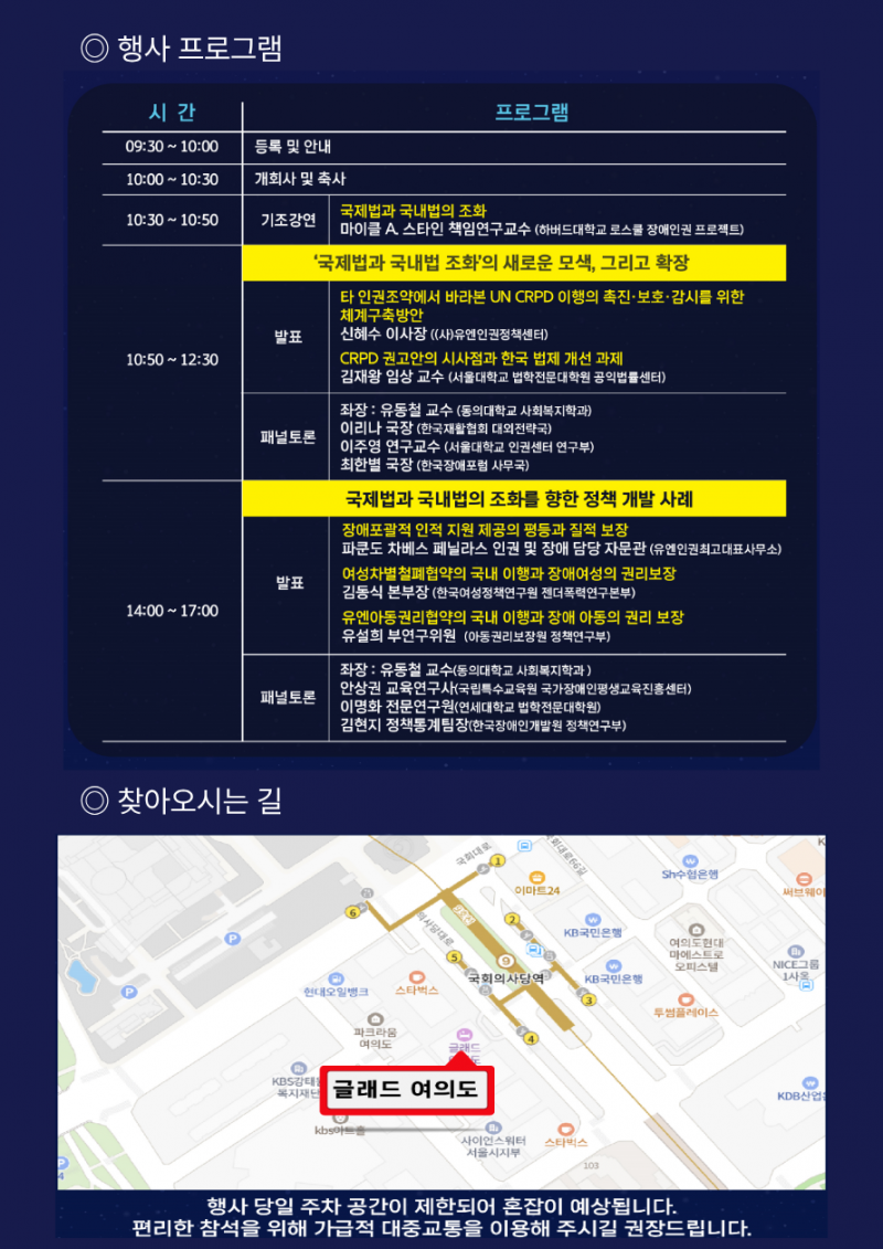 기조강연은 마이클 A. 스타인 하버드대 로스쿨 책임연구교수가 맡아 ‘국제법과 국내법의 조화’를 주제로 발표한다. 이어 신혜수 유엔인권정책센터 이사장이 ‘UN CRPD 이행의 촉진·보호·감시 방안’을, 김재왕 서울대 로스쿨 공익법률센터 임상교수가 ‘CRPD 권고안의 시사점과 한국 법제 개선 과제’를 주제로 발표한다.