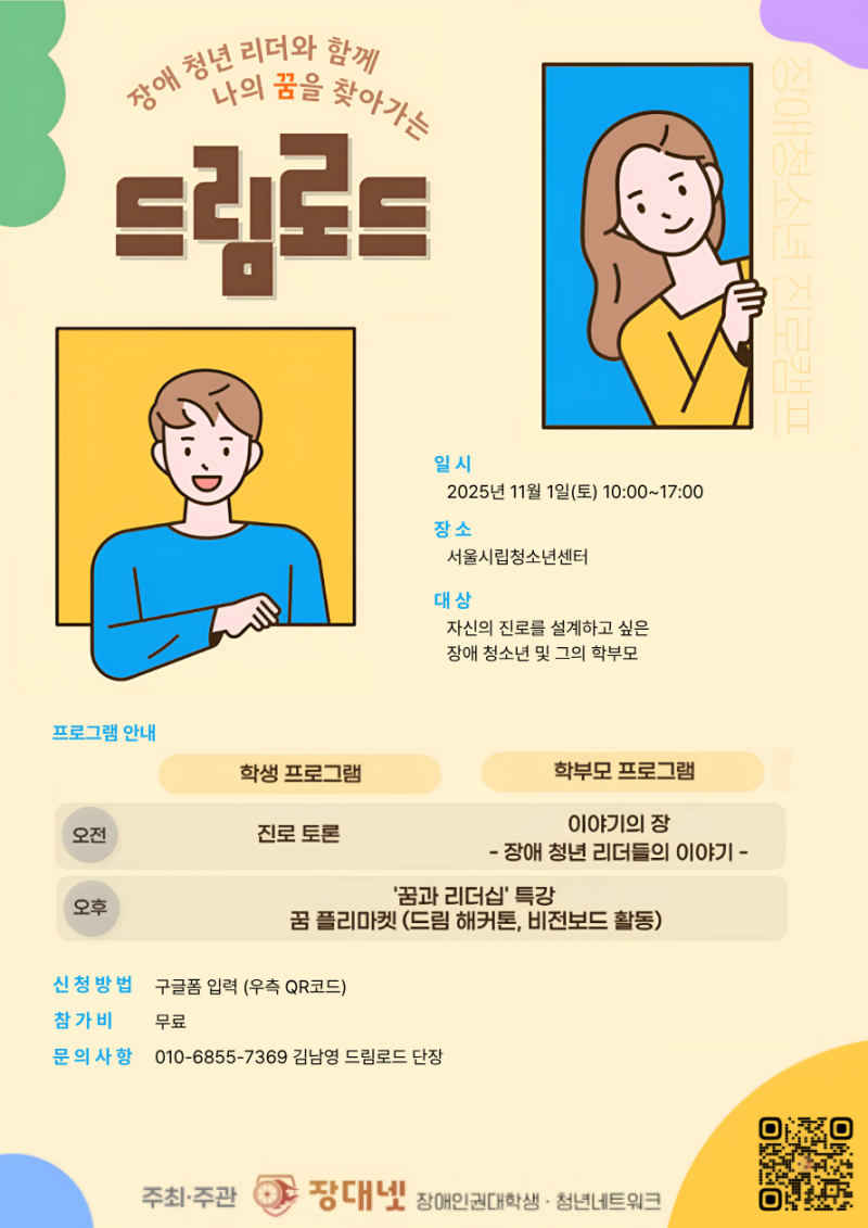 장애 청소년의 진로 탐색과 사회적 소속감 향상을 위한 체험형 프로그램 ‘드림로드’가 오는 11월 1일 서울시립청소년센터에서 열린다.